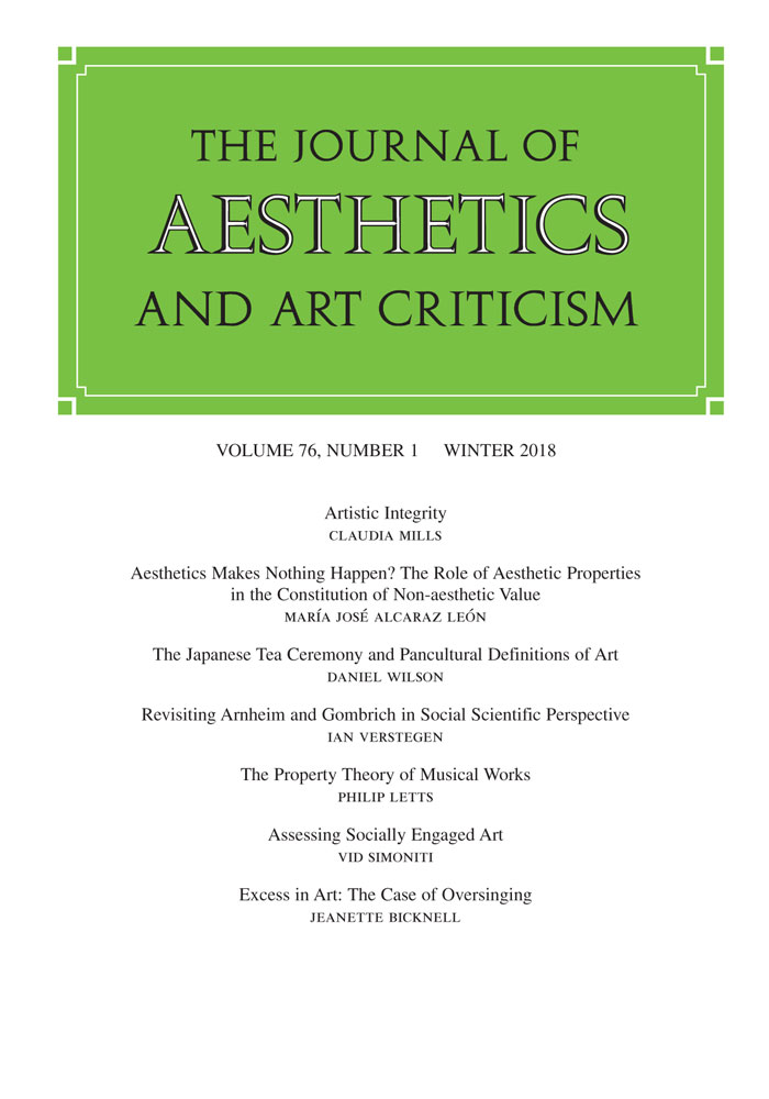 The Journal of Aesthetics and Art Criticism publishes current research articles, symposia, special issues, and timely book reviews in aesthetics and the arts. The term aesthetics, in this connection, is understood to include all studies of the arts and related types of experience from a philosophic, scientific, or other theoretical standpoint. The arts are taken to include not only the traditional forms such as music, literature, landscape architecture, dance, painting, architecture, sculpture, and other visual arts, but also more recent additions such as photography, film, earthworks, performance and conceptual art, the crafts and decorative arts, contemporary digital innovations, and other cultural practices, including work and activities in the field of popular culture.